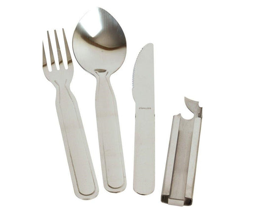 A knife, fork and spoon set. Includes can opener. Stainless steel construction, clip together for compact size in transit.