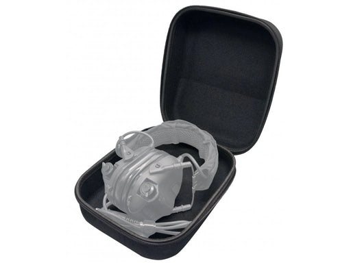 A rigid case for passive and active ear protectors, as well as regular headphones. Dimensions accommodate folded headphones with a rigid headband....