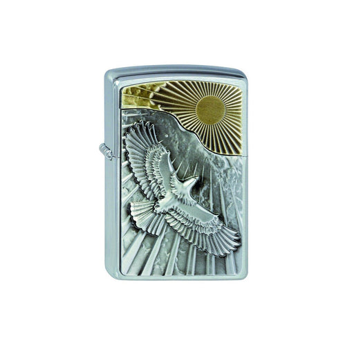 ZippoEmblem detailing features an Eagle flying towards the sun. A stylish trick emblem design on a chrome brushed lighter. Genuine Zippo windproof lig...