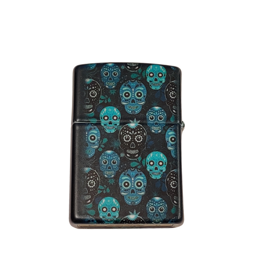 ZippoA matte black lighter with a blue/green skull design. Theme based on the Mexican holiday Día de Muertos (Day of the Dead). Glow in the dark model....