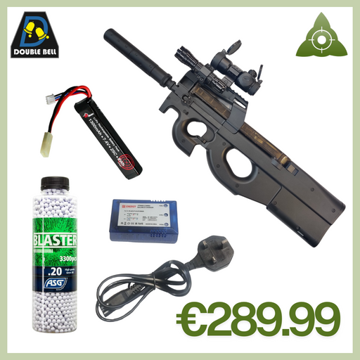 Double BellEverything you need in one package! Double Bell P90 - w/ Scope, Torch & Suppressor ASG Blaster 0.2g 3300 BBs. Vapex 7.4V 1300mAh 25C LIPO ...