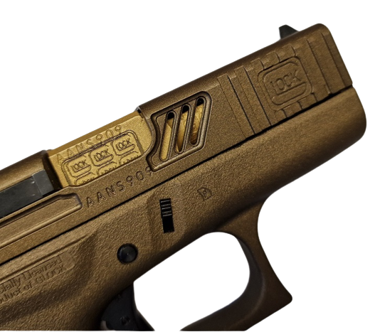 - Additional laser etching has been completed on the ejection port and outer barrel with Glock insignia. "Custom 42" laser etching on the left side of the frame completes the custom work.
