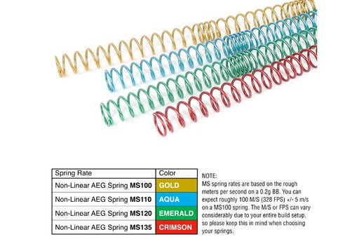 A set of four high quality AEG gearbox main springs. Non-linear, irregular pitch design. Heat-treated for greater strength and consistent compres...