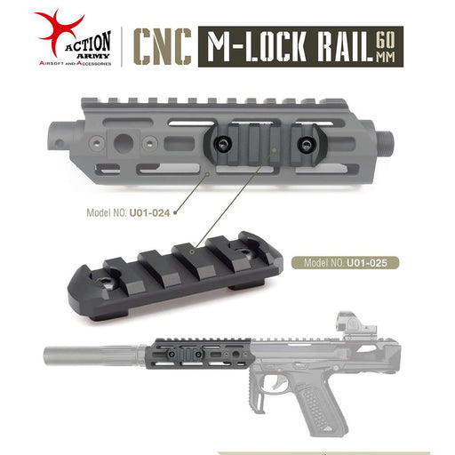 Action ArmyRail set for the Action Army AAP01 M-Lock Rail Handguard. This set includes one rail section and the hardware to attach them. 60mm in length, 5 ...