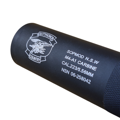 A well-crafted aluminium silencer from T&D, with both 14mm CW and CCW threads. White Navy / SopMod M4A1 markings. Textured cross section for e...