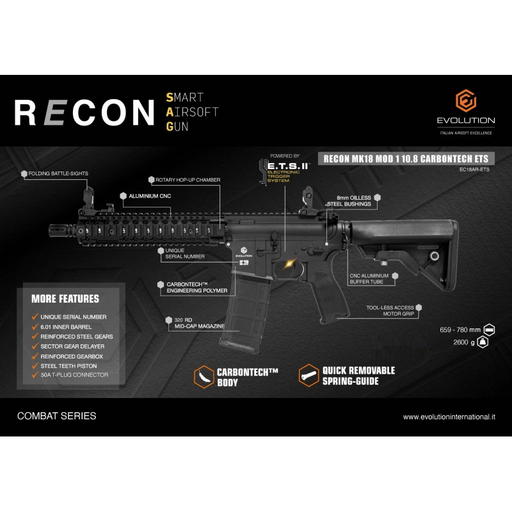 EvolutionThe Evolution Recon MK18 comes with a 10.8" outer barrel and 9.5" metal rail. Carbontech upper and lower receiver with white stamped Evolution mar...